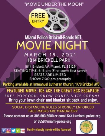 Miami Pd On Twitter Brickell Movie Night Tomorrow March 19 At 1814 Brickell Park Seating Time Is 6 15pm And The Movie Starts At 7pm Free Popcorn Snow Cones And Ice Cream
